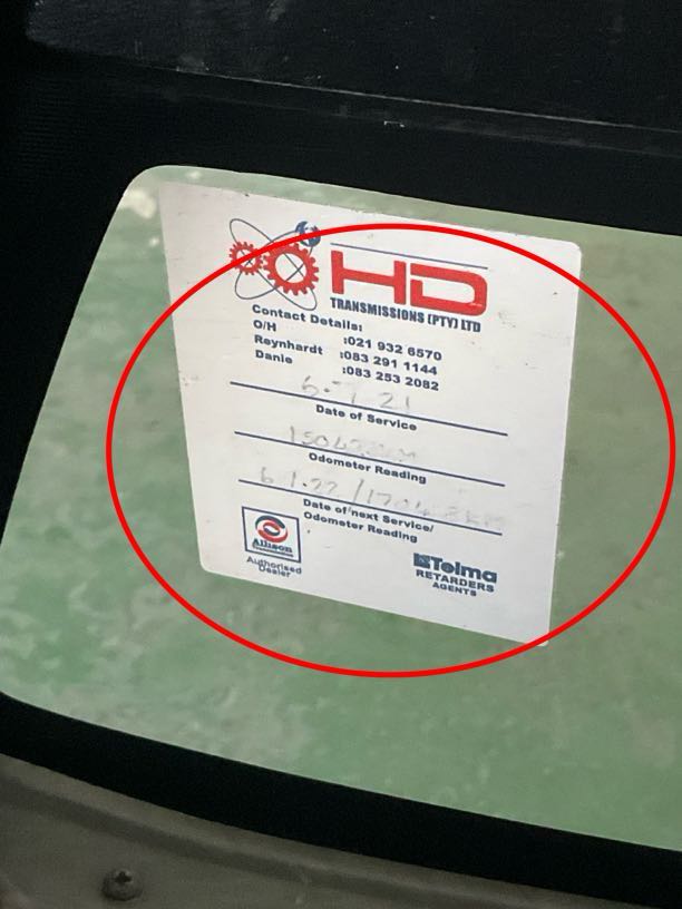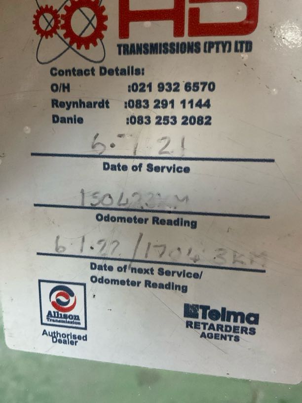 | Drivetrain | R5 000 | Retarder/Intarder | Telmar last serviced on
