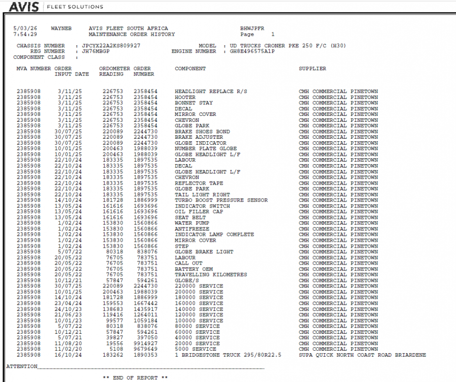 | Brakes | R5 000 | Air Leaks | Leak under cab drivers side to be